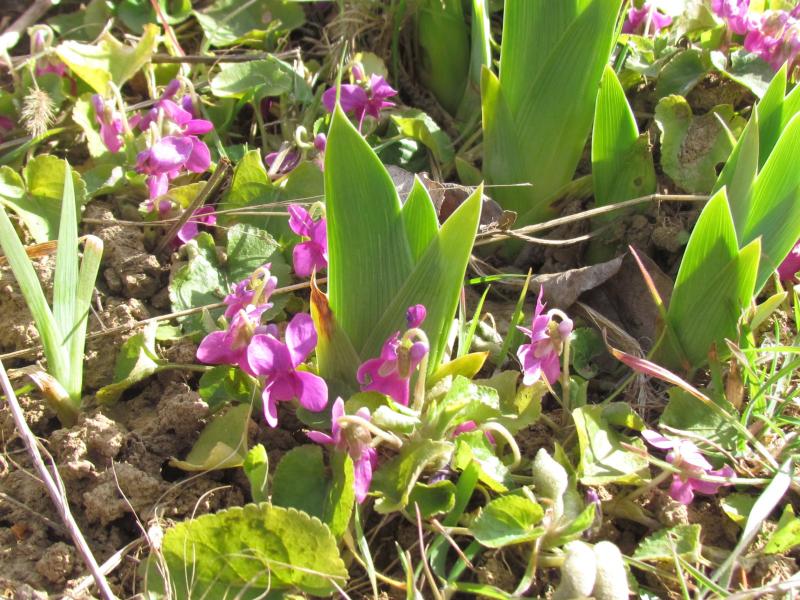 Zwischen den Iris haben mich gestern mehrere leuchtend pinkfarbene Veilchen angeschrien, wie auch immer die da hingekommen sind.
