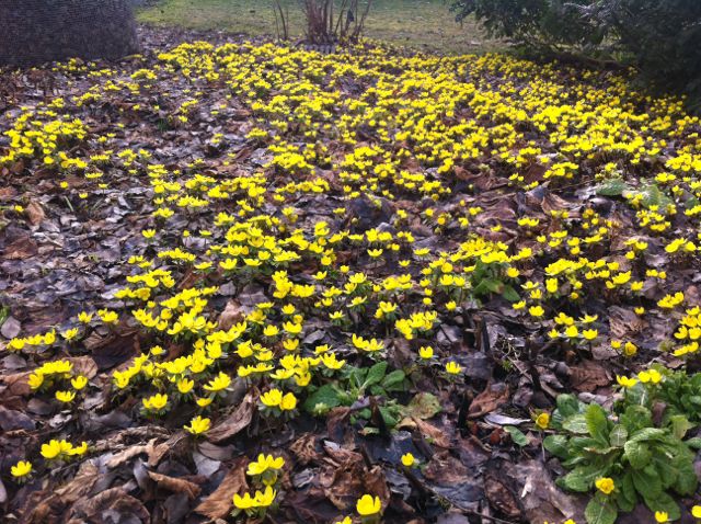 So sieht es im Januar/Februar im Vorgarten eines Freundes von uns aus. Und das ist nur ein Ausschnitt! Nach den Eranthis blühen unzählige bunte Primeln, die auf dem Bild noch unter Laub sind. Im Sommer dann Polemonium, Ringelblumen, Akelei,...... Und im Herbst fährt er mit dem Rasenmäher drüber und schüttet Laub drauf. Fertig. ;D