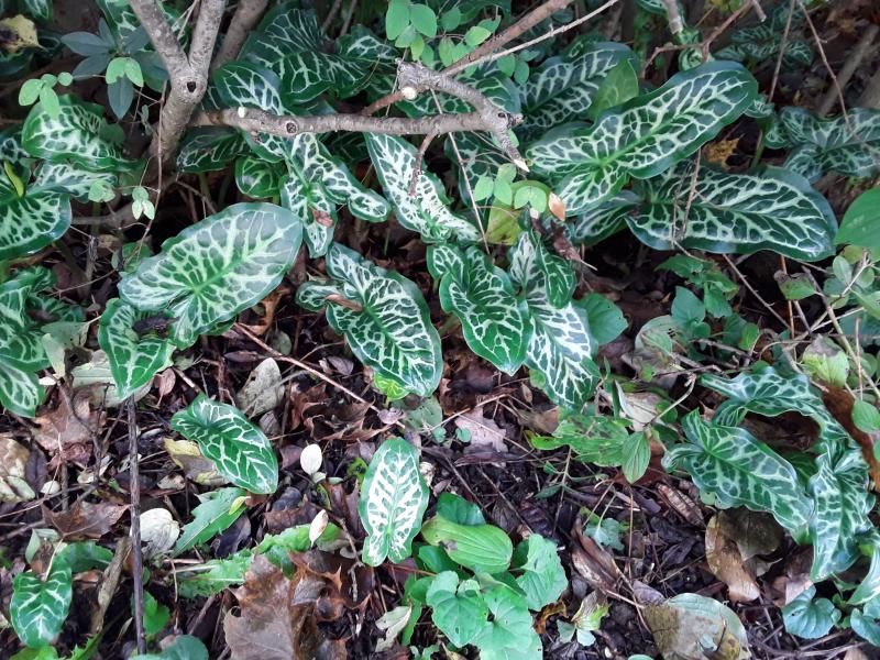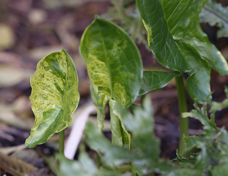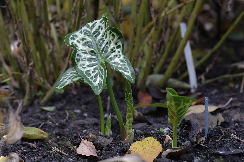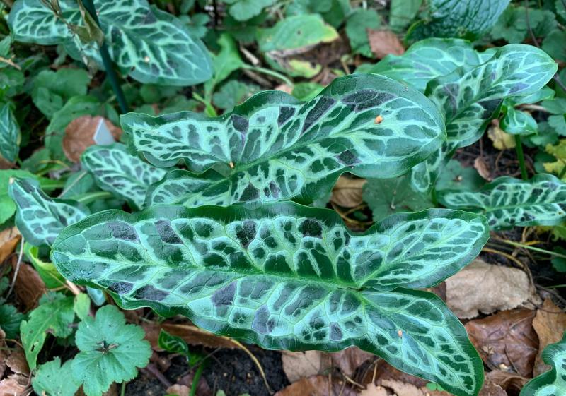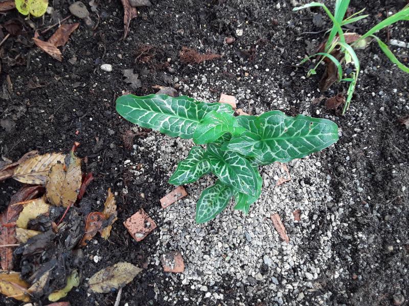 ‚Spottend Jack‘ hat sich gut entwickelt und taucht an verschiedenen Stellen im Garten auf. Er gehört zu den kleineren Arum italicum.