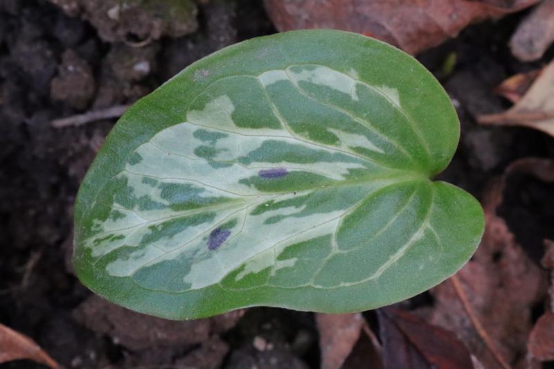 Dieser Zufallssämling ist schon etwas älter und steht ganz woanders. Wie der an seine schwarzen Punkte kommt, weiß ich nicht. Ich bin gespannt auf die Infloreszenzen, da werde ich mehr über die Elternschaft erfahren. Bei Arum italicum und seinen Hybriden scheint die schwarze Zeichnung oberflächlicher zu sein als bei Arum maculatum, die Blattoberfläche wirkt nie so verkrumpelt dadurch.