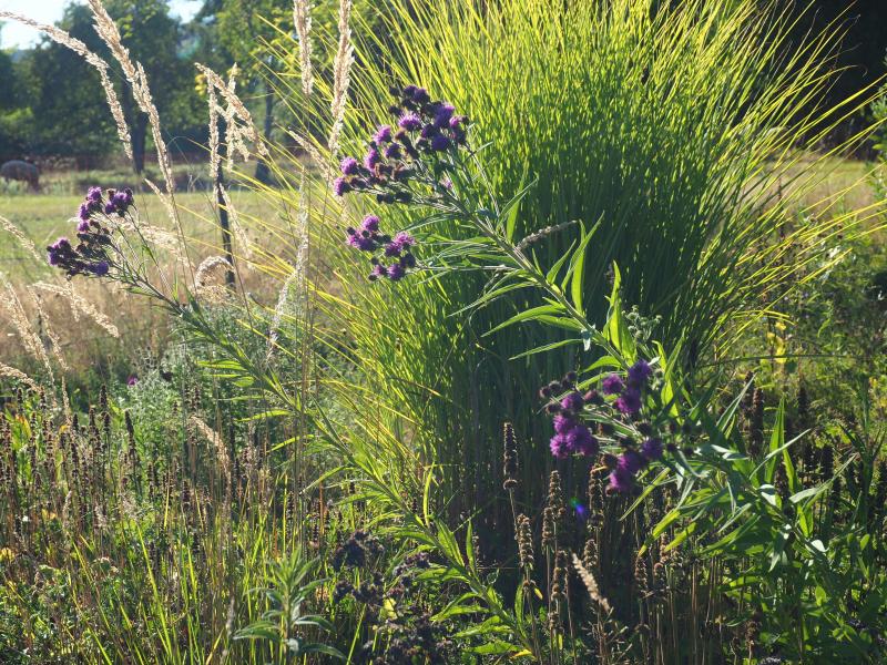 Vernonia crinita und Calamagrostis 'Karl Foerster' vor Miscanthus 'Grazillimus'. Karl Foerster tut es auf Dauer mit dieser Trockenheit nicht gut.