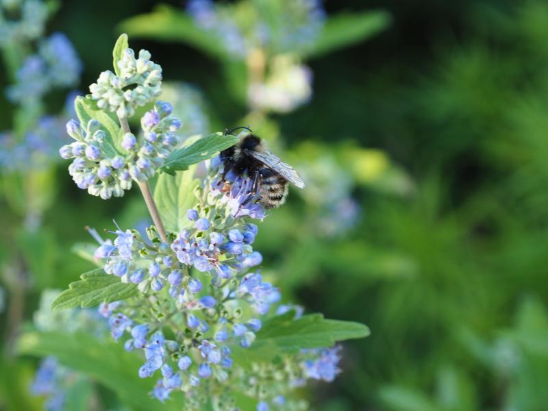 mehr Hummeln auf Vitex agnus-castus. Bei vehementen Bienenschützern, also Wildbienenschützern, sind ja ausländische Pflanzen verpönt. Unsere Wildbienen sind aber nicht rassistisch, die mögen auch Vitex und Caryopteris sehr, sehr gerne.