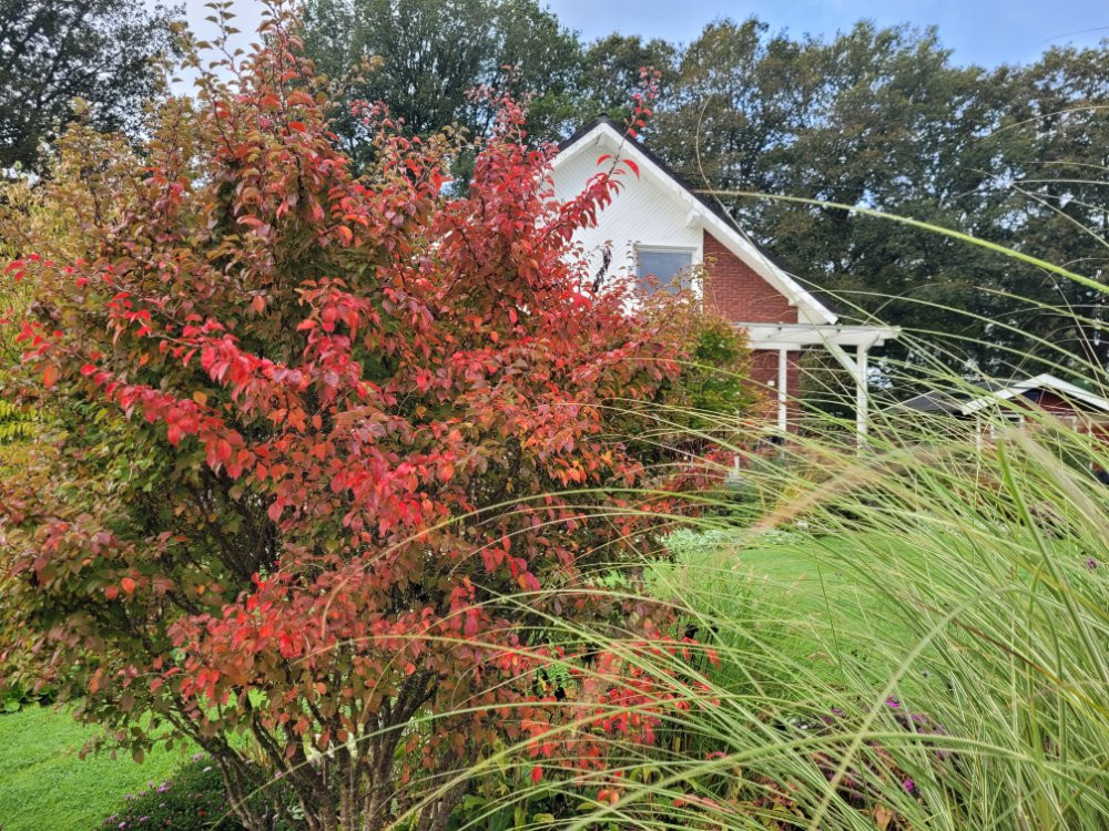 Aber wer sagt, dass Rhodos nicht auch Herbstfärbung haben können, nicht alle, aber dieser größte und schönste im Garten. Uralt, Name natürlich unbekannt.