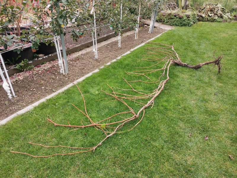 Und Minimalschnitt bei Tafeltrauben, wir versuchen es jetzt doch mal im Nachbargarten. Eine Rebe, 8m Fruchtwand.