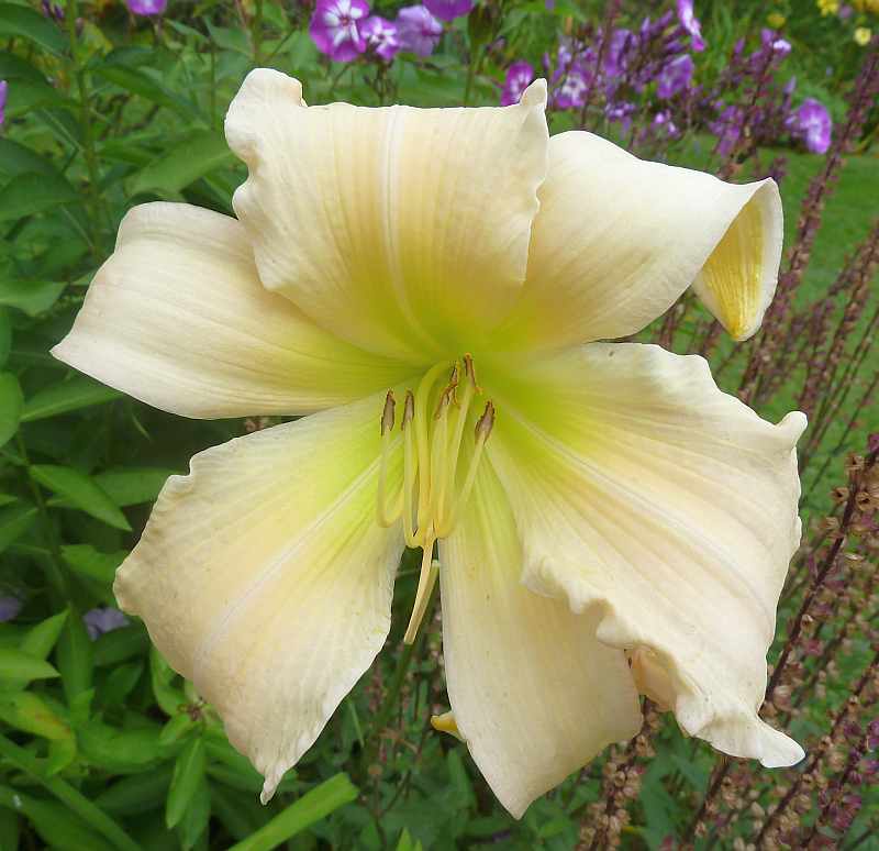 Recht unbeeindruckt von den nächtlichen Regengüssen zeigte sich am Morgen auch August Frost, eine Sorte, die ich wegen ihrer Stengelhöhe von über 90 cm sehr schätze.