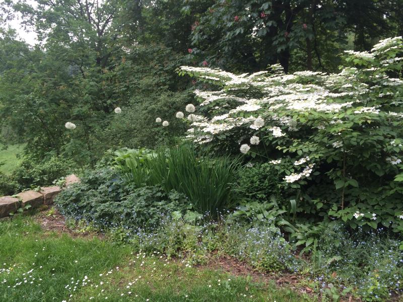 Oben Spirea die ordinääääre,…..Sorte weiß ich nicht, dann Viburnum plicatum Mariesii, Farne, eine Weide Sorte ebenfalls unbekannt, Gänseblümchen und einiges Unkraut ;D