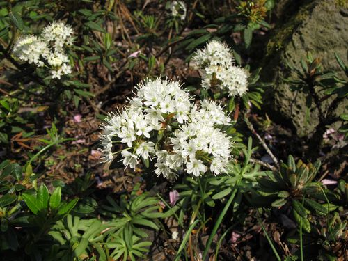 Schwer zu bestimmen. Wären die Blätter schmaler, wäre es ein Ledum palustre (= einheimischer Sumpfporst), der inzwischen in Rhododendron tomentosum umbenamst wurde. So aber tippe ich auf Rh. groenlandicum, den ehemaligen Ledum groenlandicum.So oder so: Ein ausgesprochen attraktives und blühfreudiges Sträuchlein.