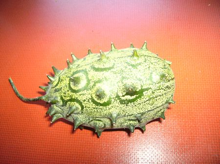 . Aus meinen Melonen ist dieses Jahr leider nichts geworden, aber kürzlich habe ich eine unreife Kiwano geerntet, die wollen nicht orange werden, so dachte ich, ich mache mal eine ab und lasse sie liegen. Mal sehn, ob sie sich eher färbt als die im Freien und ob sie es überhaupt tut. Es könnte ja auch sein, daß sie erfrieren, bevor sie reif sind
