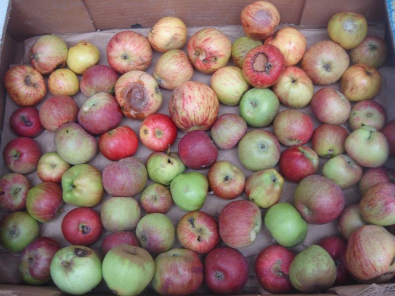 Hier produzieren die Apfelbäume wg. der anhaltenden Trockenheit massenhaft Fallobst. Hier eine von vielen Obststiegen.