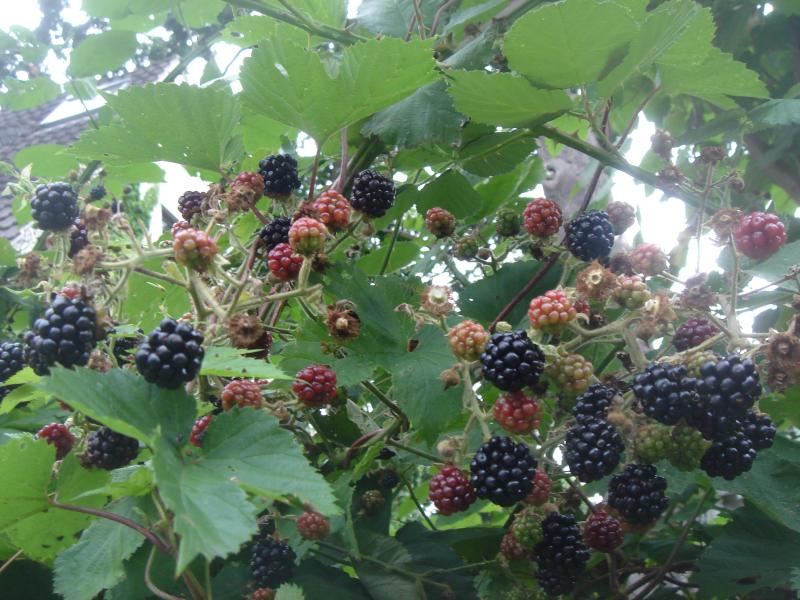 In den vergangenen 2 bis 3 Wochen in Maßen Stachelbeeren, natürlich schwarze, rote und weiße Johannisbeeren, dazwischen wenig Himbeeren und jetzt Brombeeren und frühe Pflaumen. Die ersten blauen Weintrauben sind auch schon zum probieren da.