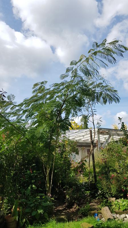Albizia an der Terrasse - tödlich, ist Nordseite und die frostigste Ecke im Garten.