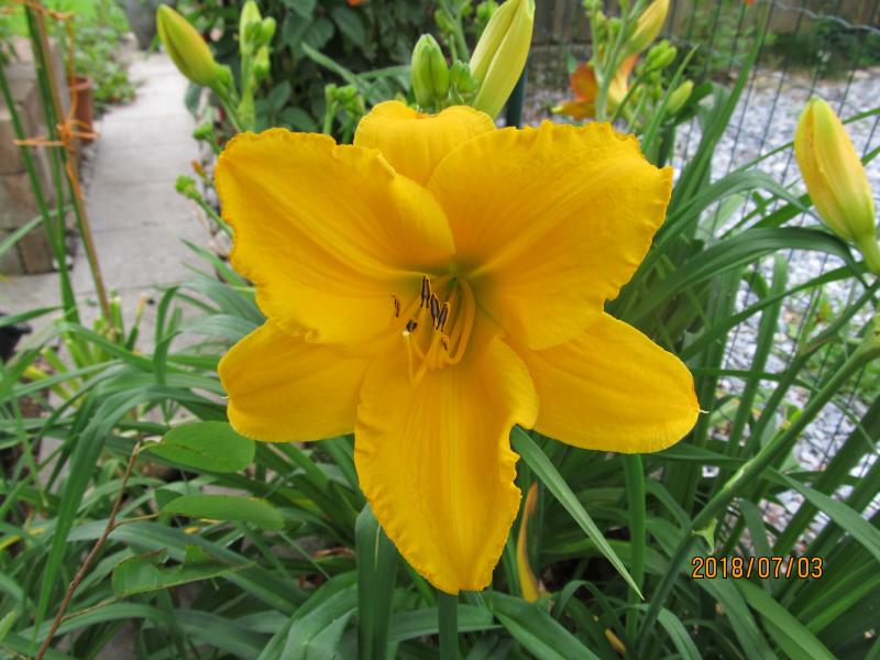 Hier beginnt er immer in der ersten Juli-Hälfte und hält bis in die erste Augusthälfte durch - Blütendurchmesser 18 cm, Höhe knapp 100 cm - nur gelb aber jeder bleibt stehen und fragt, was das für eine ist (steht am Zaun) - Arbeitsname Pirate's Gold