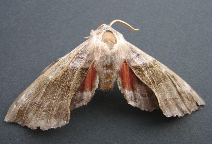 Pappelschwärmer Laothoe populiBei Störungen präsentiert der Pappelschwärmer zur Abschreckung die orangen Flecken auf den Hinterflügeln.Diesen stört nichts mehr, er ist nämlich tot.