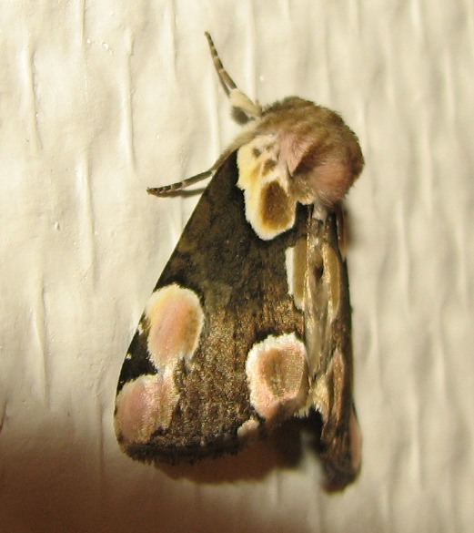 Roseneule, Brombeereule Thyatira batis L.Obwohl der Name des Falters Roseneule ist, gehört er nicht zur Familie der Eulenfalter (Noctuidae) sondern zu den Sichelflüglern bzw. Eulenspinnern (Drepanidae).Die Vorderflügel sind grau und tragen weiß eingefaßte rosa bis braune Flecken. Die Oberseite der Hinterflügel ist braun gefärbt und weist in der Mitte ein etwas helleres Band auf.
