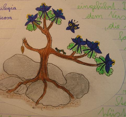 @mackrantha ;)Hey, ist schon klar. War ja auch lustig, weil ich es erst gar nicht kapiert habe. Was glaubst du wie ich gestern gelacht habe als ich mir nochmal die ersten Seiten angeschaut habe un mir dann plötzlich geschossen ist wie dus gemeint hast. ;DWas diese Symbiose mit dem Schmetterling betrifft, das war natürlich genau so eine Schnappsidee wie die Phantasieakelein. Hab mir das damals so vorgestellt. Die Pflanze zieht sich während der Trockenheit zurück ins Holz und treibt erst dann Blätter und Blüten aus wenn es regnet. Dann schlüpfen auch die Scmetterlinge aus denPuppen, die an den Zweigen hängen und bestäuben die Blüten. Dafür legen sie aber auch ihre Eier an den Blättern ab, aus denen dann Raupen schlüpfen die diese auffressen sich verpuppen und dann wider zusammen mit der akelei auf die nächste Regenzeit warten.... ;DIn echt ist es ja leider bei uns eher selten das Schmetterlinge an Akelein anzutreffen sind. Außer an meiner Aquilegia flavescens- Hybride. Ist glaub ich ein Kohlweißling