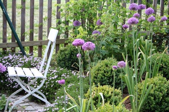 Hier mache ich meist meine Kuchen-Pause. Allium blüht mit Thymian um die Wette. Die beiden harmonieren in der Farbe. Dazwischen habe ich etliche Geraniums renardii gesetzt. Der hält die absolute Trockenheit aus und bildet bis zum Spätherbst einen schönen Horst.