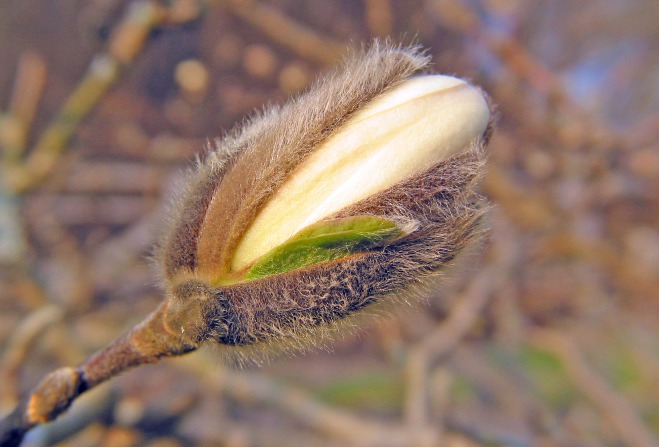 Sternmagnolie Magnolia stellata Die Sternmagnolie hat heute ihre ersten wunderschönen, matt weißen Sternblüten geöffnet. Die waren aber für eine Nahaufnahme zu weit oben angesiedelt. Also habe ich mich an eine untere Knospe gehalten.Ich hoffe nur, daß die Spätfröste ausbleiben. Wäre wirklich schade.