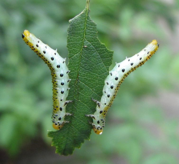 Ich hatte gestern abend noch Ballettaufführung. Und das gratis.Bei diesem schönen Duo handelt es sich um Blattwespenlarven. Vermutlich die Art Arge pagana. Die Wespen sind fast ganz schwarz, der Hinterleib vorwiegend gelb.