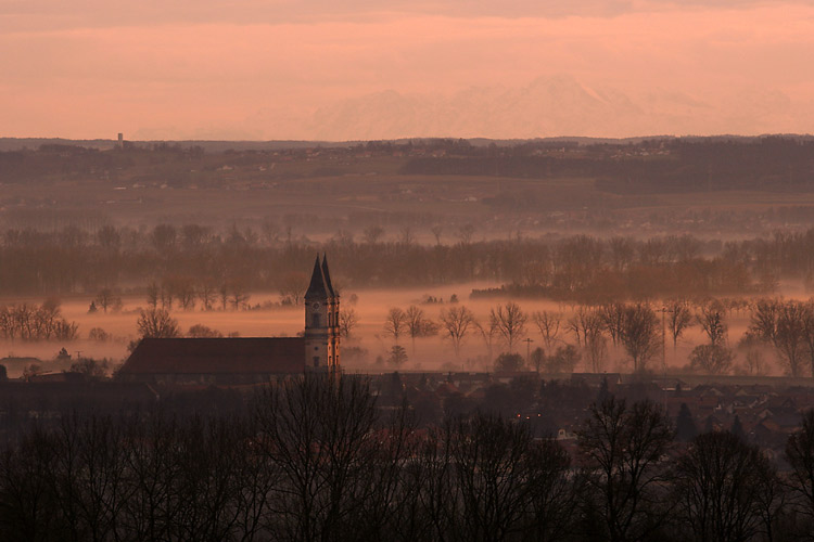 Das hier ist das Benediktiner-Kloster Niederalteich. Ganz in der Nähe gehen meine Jungs zur Schule. Man beachte die Alpen ganz zart im Hintergrund. Sie sind relativ selten von uns aus zu sehen, nur bei Föhnwetterlage. Ich habe hier mit dem Weißabgleich bewölkt fotografiert. Das gibt einen gelblich-warmen Farbton
