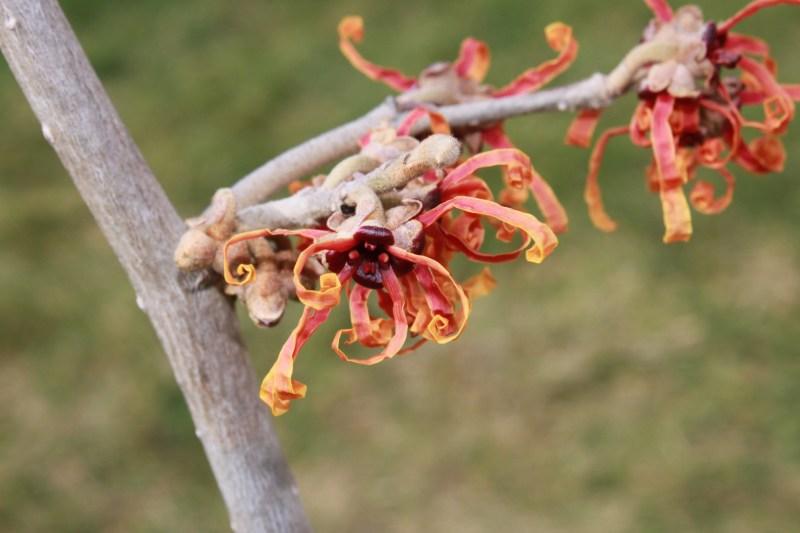 Ich habe die H. 'Sunburst', die mal in Boskoop wegen der lange haftenden Blätter eine schlechte Bewertung bekam. Die Sache sieht eigentlich jedes Jahr anders aus: Mal haften die Blätter bis zum Neuaustrieb, mal sind sie spätestens Weihnachten abgefallen. Heuer hängt nichts mehr dran, aber die Blüte hat noch nicht begonnen.Als "Ersatz" ein Bild von gestern von H. 'Orange Beauty' (noch ziemlich knittrig, aber es wird!):