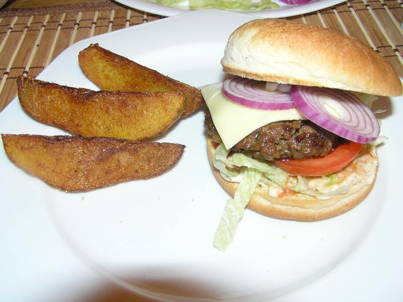 cheeseburger mit kartoffelwedges.