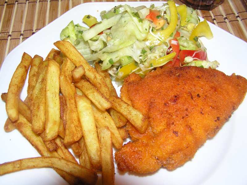 hier gabs vorhin hähnchen cordon bleu mit pommes, dazu eisbergsalat mit paprika, gurken und sprossen.örks...nie wieder fertiges cordon bleu *schüttel*