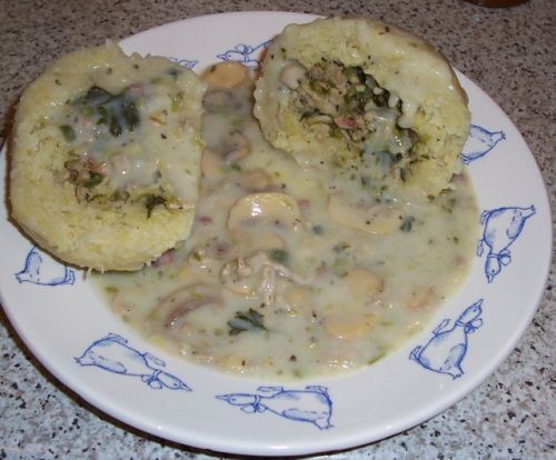 Bei uns gab es "Gefillde Kleeß".Mein Vater hat sich das schon immer mal gewünscht, es ist ein Gericht aus seiner Heimat, dem Saarland.Die Gefillde sind halb und halb Kartoffelklöße die gefüllt werden mit Schinkenspeck, Hackfleisch und Lauch.Dazu habe ich eine Champignonsoße gemacht.