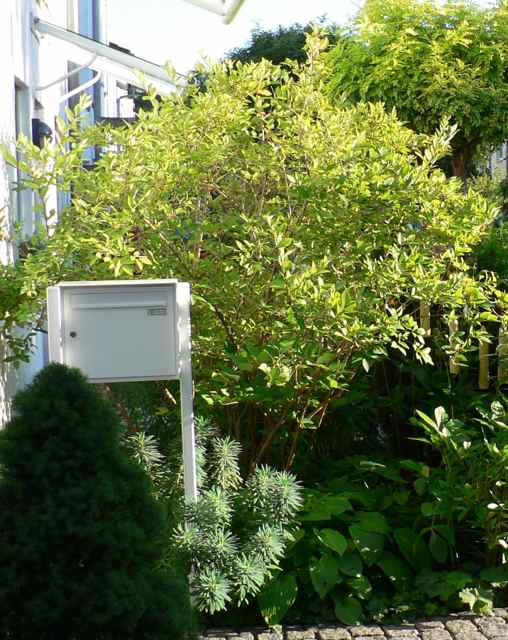 Aber immer noch attraktiver als die Lonicera! In dem Bild steht sie sehr sonnig und ist wohl daher auch so buschig, aber die Blätter sind bei mir viel dunkler.