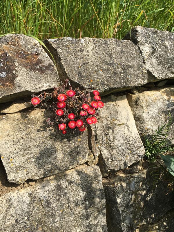 hier wachsen die Delosperma-Hybriden auch in Verbindung mit Steinen. Letztes Jahr sind einige vertrocknet.