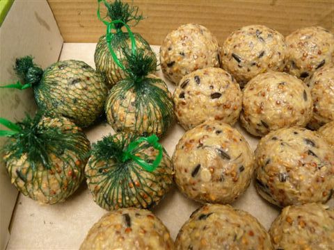 Meinen Rotkehlchen streuen ich das Futter (gehackte Nüsse und Flocken), unter die Stäucher, das ist aber auch ein gefundenes Fressen für Mäuse, falls die Rotkehlchen nicht alles wegputzen.Heute wurden die Meisenknödel geformt, eine Wohltat für Gärtnerhände