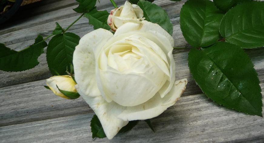 ein Tag später, kaum Veränderungen... aber es soll ja jetzt etwas wärmer werden, ideales Rosenwetter ist im Anmarsch...Der Freiburger Perle hat der Regen jedenfalls leicht zugesetzt (und die Dickmaulrüssler, man beachte die Fraßspuren an den Blättern links):