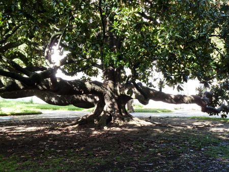 Seitlich von der Achse gibt es ausgedehnte Waldflächen mit Sichtachsen und altehrwürdigem Baumbestand.Mich begeisterte diese Magnolia grandiflora, die ich sie noch nie in so schöner Wuchsform gesehen habe.