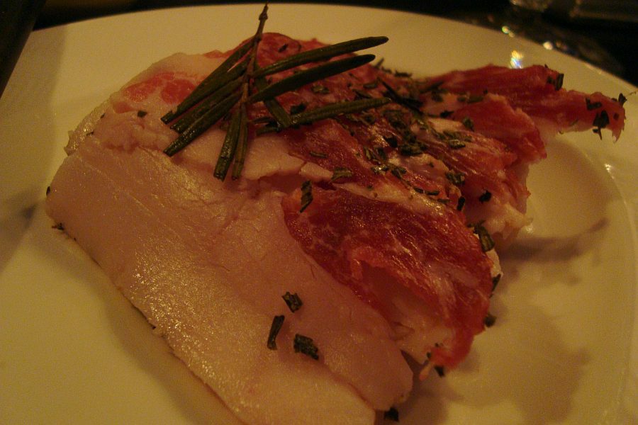 dazu - neben zwei pasteten und in schinken angebratenem ziegenkäse - diesen leckeren rosmarinierten speck...