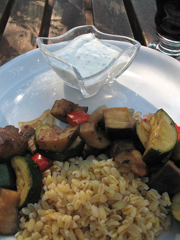 Heute gab es Backofengemüse mit Ebly-Weizen und davor einen Lollo Rosso. Dazu gab es Koriander-Knoblauch-Joghurt.