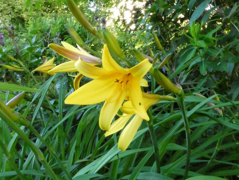 Irgendwie scheint es so ziemlich unmöglich zu sein, eine gesicherte Beschreibung zu Hemerocallis lilioasphodelus zu bekommen. Ich habe hier ja auch jede Menge gelbe Taglilien, die Ende Mai, Anfang Juni blühen. Das Laub ist straff aufrecht, höchstens leicht überhängend, sattgrün, und hat vor dem Einziehen im Spätherbst oft noch eine goldgelbe, manchmal auch rötlich überhauchte Herbstfärbung. Die Blüten duften leicht, besonders am Abend, und mit der Zeit werden die Horste durch kurze Ausläufer immer dicker, ohne Wucher-Tendenzen zu zeigen. So sieht meine zur Blütezeit aus: