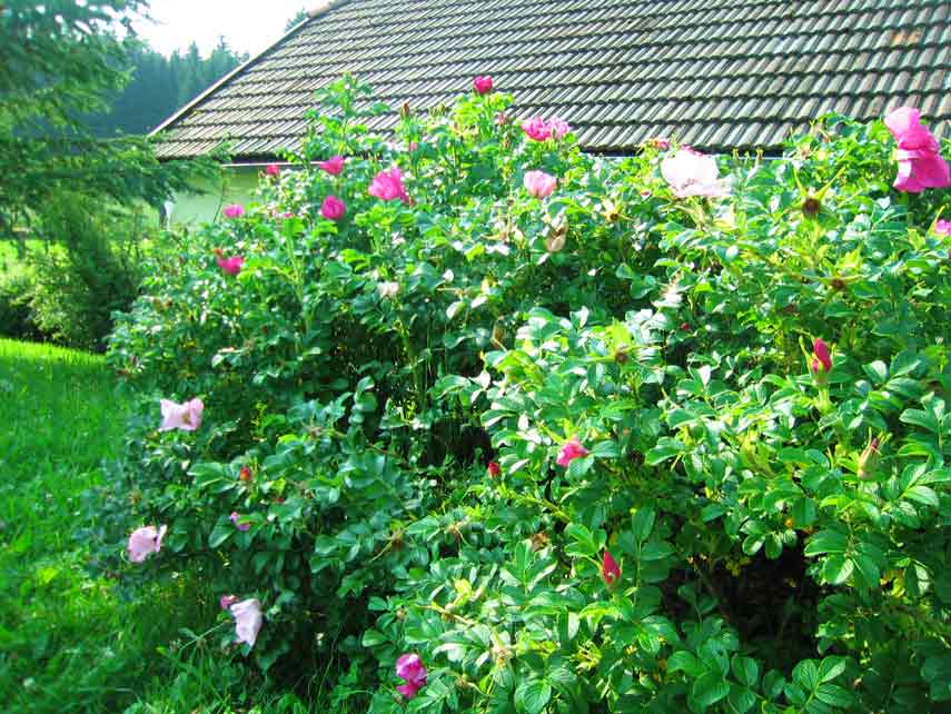 ;)Dachte nämlich, daß es vielleicht ganz hilfreich wäre, auch die Vergangenheit zu erwähnen, denn so einige Rosen haben bei mir ja bis 2009 durchgehalten. Und das bedeutet, daß sie woanders -20°C und ev. wenig mehr durchaus wegstecken könnten. Die meisten Bilder habe ich hier schon früher gezeigt, ich hoffe, es stört sich niemand dran. Bei der Durchsicht der Fotos habe ich noch ein Bild von der Rugosahecke gefunden. Ursprünglich standen dort ein paar Dagmar Hastroops um die Kellerlüftung herum, die Sämlinge hab ich dazugesetzt: