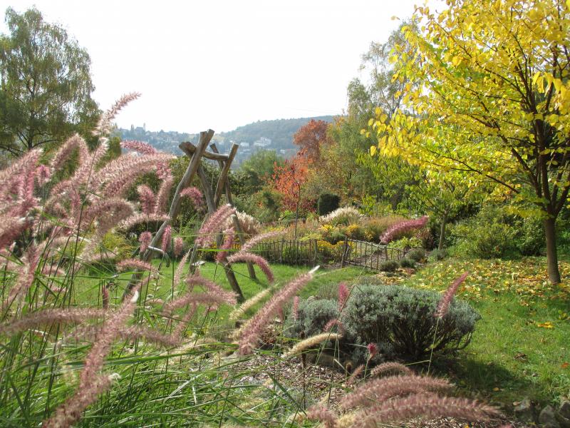 Blick über das Beet in die Ebene.