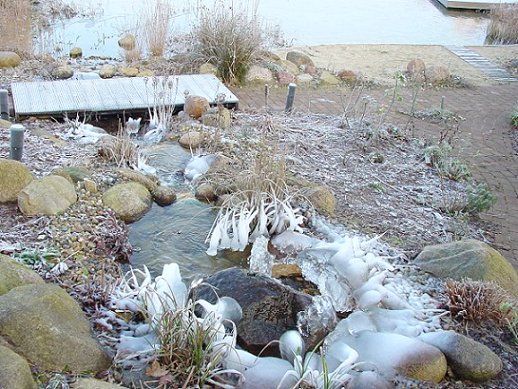 Hallo,im Gegensatz zu vielen von Euch, bin ich nur ein normaler Hobbyfotograf aber ich hoffe, das Bild gefällt Euch trotzdem. Bei uns am Teich, besonders am Bachlauf entwickelten sich im Winter immer die witzigsten Eisskulpturen.Das Bild ist zwar bei schlechten Lichtverhältnissen (diesiges Wetter) gemacht, aber ich fand, daß die Gräserstaude fast solche Eis-Gebilde trug, die aussahen wie Datura-Blüten (rechts, Mitte Bachlauf/Bild).Da für den nächsten Tag Tauwetter angesagt war, habe ich es doch noch schnell fotografiert.