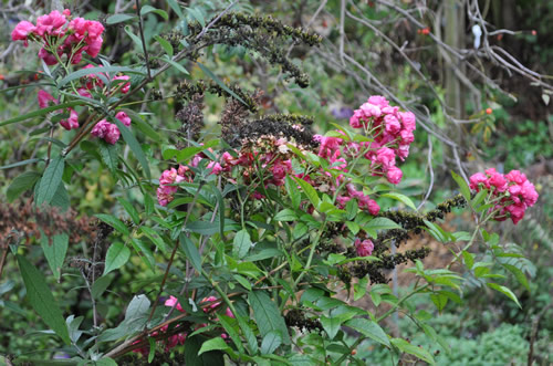 Brewood Belle, eine Dauerblüherin, hängt über der Mauer, hier von hinten. Von unten sieht es sehr schön aus, so überhängend, zum Ablichten, etwas schwierig.