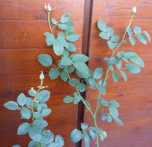 Und unterm Dachüberstand eine neugepflanzte Sissi climbing. Das ist die, wo ich erst so gejammert habe, weil sie in einem derart winzigen Containerchen kam, von Rosen-Hammer, der dann noch völlig undurchwurzelt war, da war weniger als ein 0,2l-Trinkbecher-Volumen durchwurzelt. Es hat dann jemand hier gesagt, dass er auch schon solche Rosen von dort bekommen hat, die dann brav weitergewachsen sind. Tja, scheint zu stimmen! Auch die Tea Clipper, von der ich erst fürchtete, es sei nicht die echte, weil sie mehr Stacheln hatte, als ich nach der Beschreibung erwartet hatte, ist wohl gut angewachsen. Da habe ich Rosen-Hammer wohl unrecht getan. Wobei mir normal durchwurzelte Container schon lieber sind als so eine Zitterpartie!