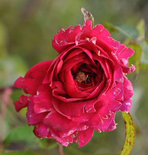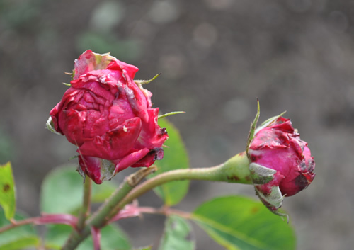 Die hatte ich auch mal, wusste gar nicht mehr, wie schön die ist, die Hoffmann, Manu.Die Coral Dawn wuchs immer mehr rückwärts, nach dem letzen Winter wars ganz aus mit ihr. Sie wird nicht mehr ersetzt.Toll, was bei euch noch alles blüht, sieht ja noch prächtig aus!fbb, warst du da nicht mal mit dem Farbton unzufrieden? Jetzt habe ich in einem Rosenbuch gelesen, sie wäre in kälteren Gegenden bräunlich, in wärmeren eher orange. :-\Hier dauert übrigens das Öffnen der Knospen auch schon ewig. Aimée Vibert hat Knospenbüschel, die wachsen langsamer als Zeitlupe.Hier hängt noch eine beduschte Brown velvet-Blüte herum:Aber Alice Hoffmann hats noch geschafft.