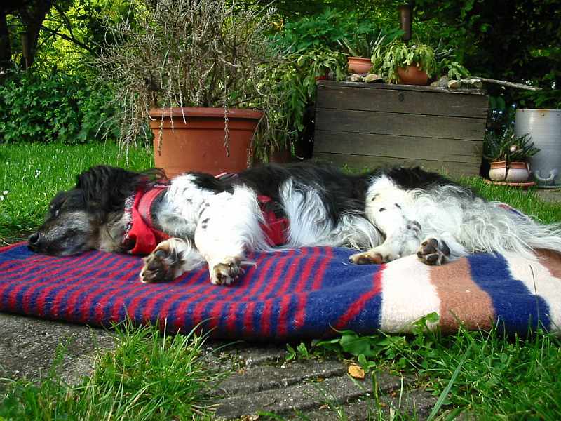 Aber er ist ein ganz altes Männchen mittlerweile, so vieles fällt ihm schwer oder er kann es gar nicht mehr. Hinlegen ist schwer, den Schwung zu holen, um aufzustehen, hören, gucken, manchmal glaube ich auch, riechen, bei Kacka machen muss ich ihn stützen, zu oft fällt er um, weil es so anstrengend ist. Fressen tut er leidenschaftlich gerne, wird aber doch immer weniger (kein Alterzucker, das kenn ich von meiner alten Hündin). Alle drei Stunden nachts trag ich ihn raus, vorher höre ich, wenn er vergeblich versucht, aufzustehen.Tagsüber draussen überkommt es ihn aber doch noch manchmal, im Galopp stürmt er schwanzwedelnd unseren Hang über die Wiese hinunter, versucht zu kläffen und dreht sich im Kreis, bis er einfach umfällt, wie eine gefällte Eiche, plumps, ist ihm dann etwas peinlich, aber ich heb ihn hoch und dann geht es etwas langsamer weiter mit den völlig wackeligen und kaputten Stelzen.Seine Tage sind sicher gezählt, aber noch helfen wir ihm gerne jeden Tag einen weiter, weil er doch immer wieder, trotz seines mittlerweile häufigen Phlegmas, immer wieder so euphorische Momente zeigt.Sein allerliebster Sport ist aber mittlerweile das hier (vorgestern beim Grillen im Garten):