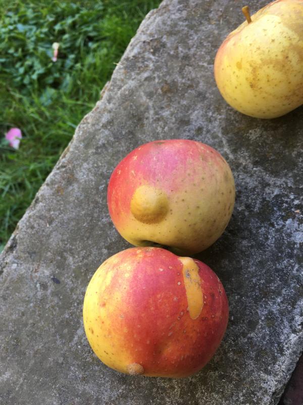 Pocken (durch Insektenstiche), also Warzen und Rostfiguren sind für den Edelborsdorfer typisch und für Fromms Goldrenette, die ja ein Nachfahre vom Edelborsdorfer sein soll.