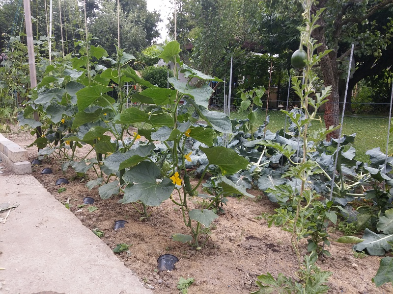 Meine Auslese der Tanja habe ich zum Schutz der parthenokarpen Hybriden in andere Gärten verlagert, um mal wieder zu den Landgurken zurückzukommen. Dort wachsen sie teilweiße an Schnüren aufgeleitet, im Beet und an Baustahlgittern mit Wäscheklammern zum aufleiten fixiert. Der eine macht mehr, der andere weniger Schnitt.