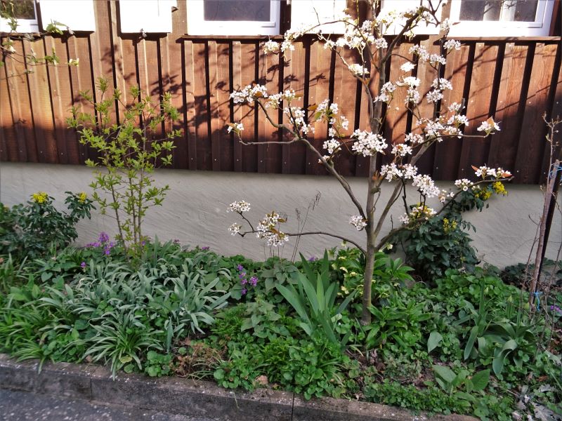 Irgendwie ist mein Vorgarten auch so was wie ein sonniger Gehölzsaum. Zumindest Knoblauchsrauke und Lunaria fühlen sich da sehr wohl. Demnächst öffnet sich auch die Zwiebeltragende Zahnwurz und später noch die Nachtviole. Die wird dann besucht vom Taubenschwänzchen.