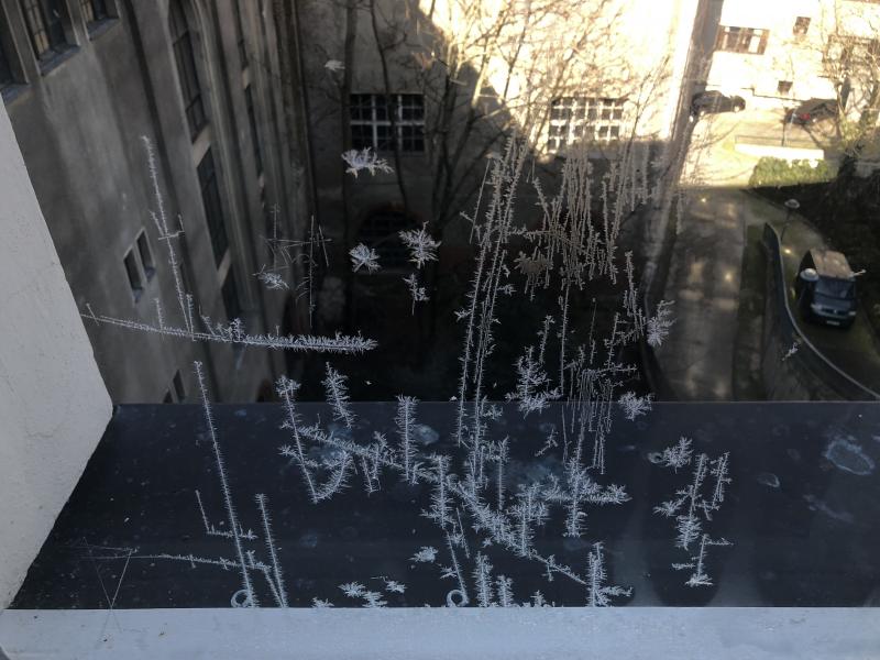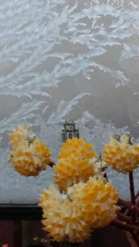 Die Kälte nervt! Blumen und Eisblumen im notdürftig beheizten Gewächshaus. Immerhin hübsch zusammen.