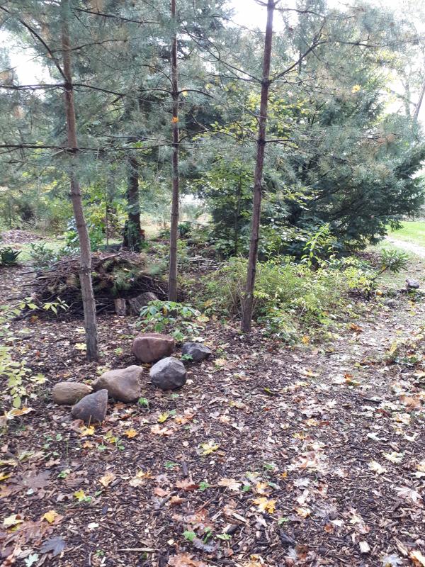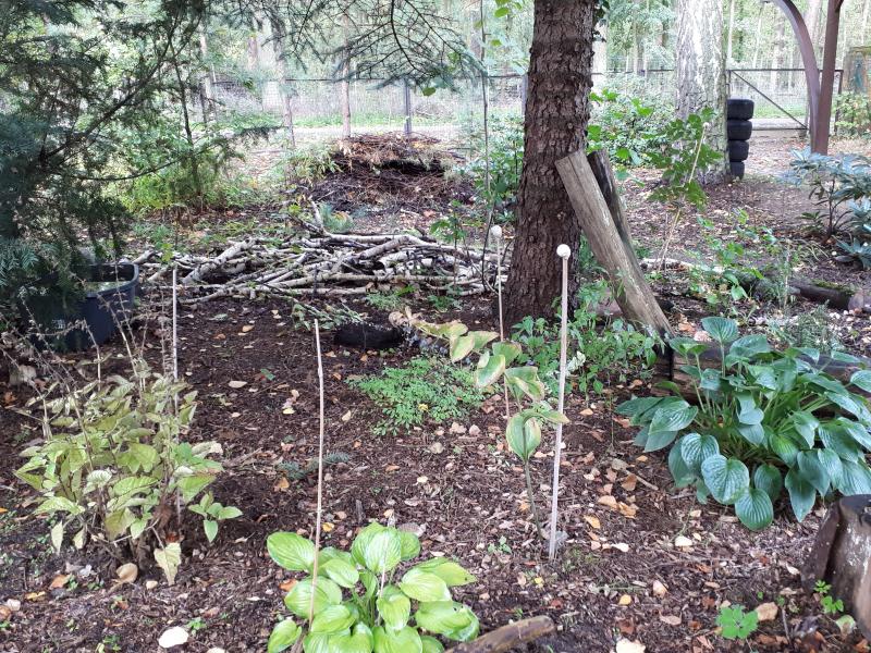 Hier hatten sich ca. 7 Kiefern ausgesäht - drei dürfen erst einmal bleiben - und genau dort hinein habe ich die Kastanie von Hausgeist gesetzt, diese buschförmige ausläufernde, in dem kleinen Totholzhaufen waren Hummeln in diesem Jahr. Ich wollte was davon abräumen - da kam ich aber ganz schlecht an. Na gut - dann habe ich was draufgelegt - so kann es gehen.
