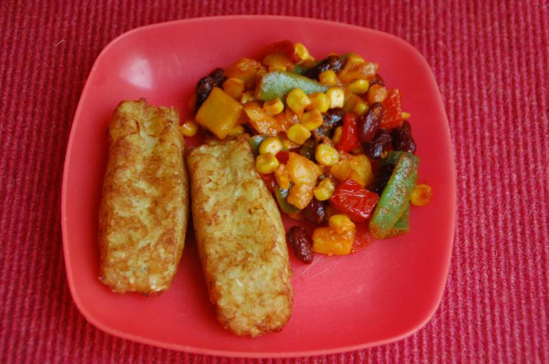 Fertigfutter: mexicanisches Pfannengemüse und frischkäsegefüllte Kartoffeltaschen