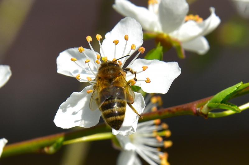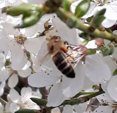 Hier sind die Bienen nun auch am Start. Die Wildpflaumen summen und brummen.