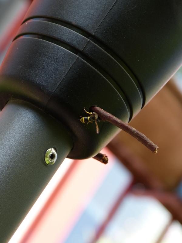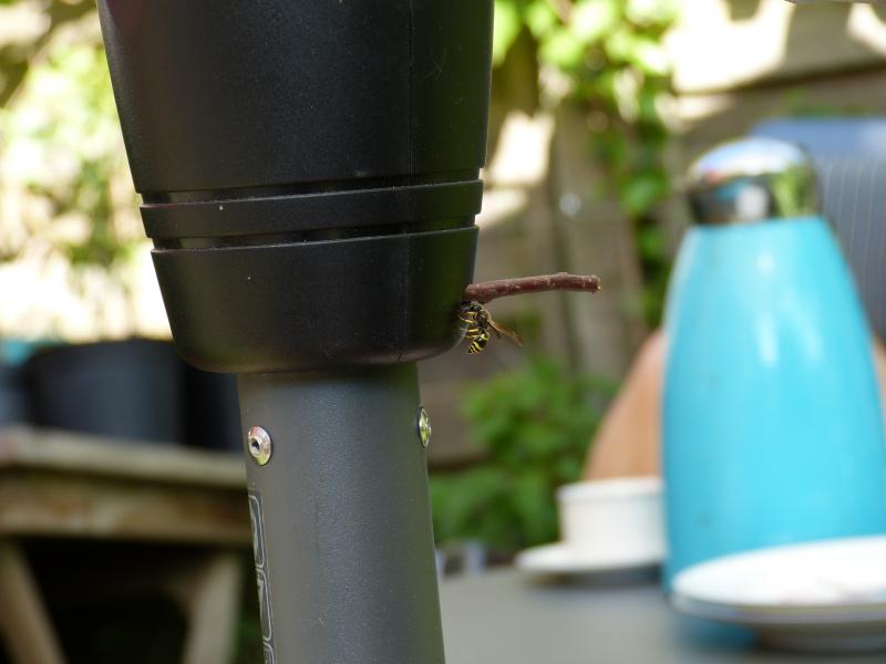 Diese Faltenwespe wollte ihr Nest in unserem Sonnenschirm bauen, was ich jedoch auf einfache Weise verhindern konnte, hätte sie doch dort ganz sicher keine Ruhe gefunden.